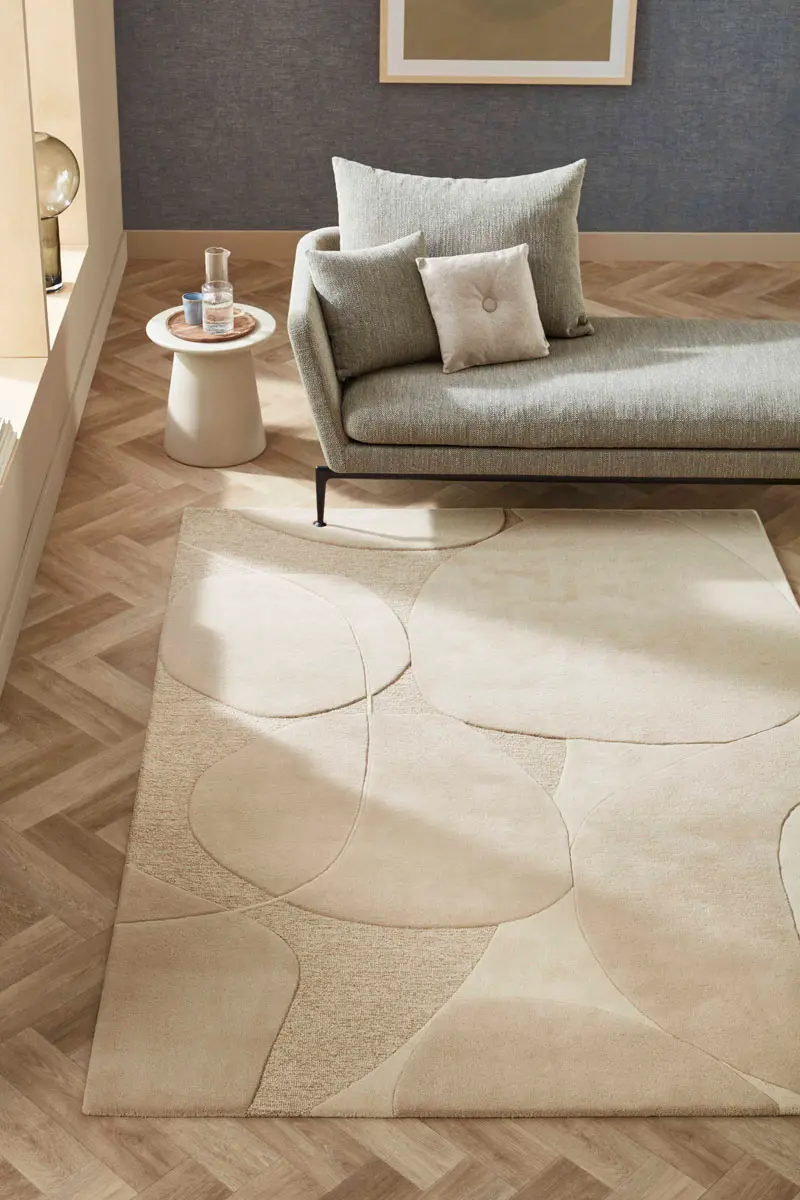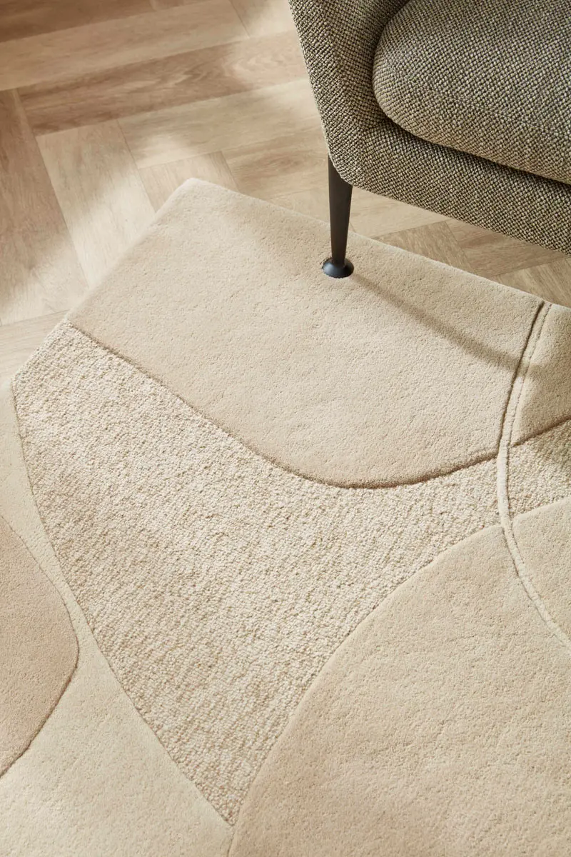 Bolsena schittert in eenvoud door haar subtiele ton-sur-ton kleurgebruik en haar organische dessin. Door de handtuft kleden te carven (scheren en knippen) ontstaat er een verrassende hoog/laag structuur. De subtiele bouclélook geeft dit vloerkleed een heel rijke uitstraling.