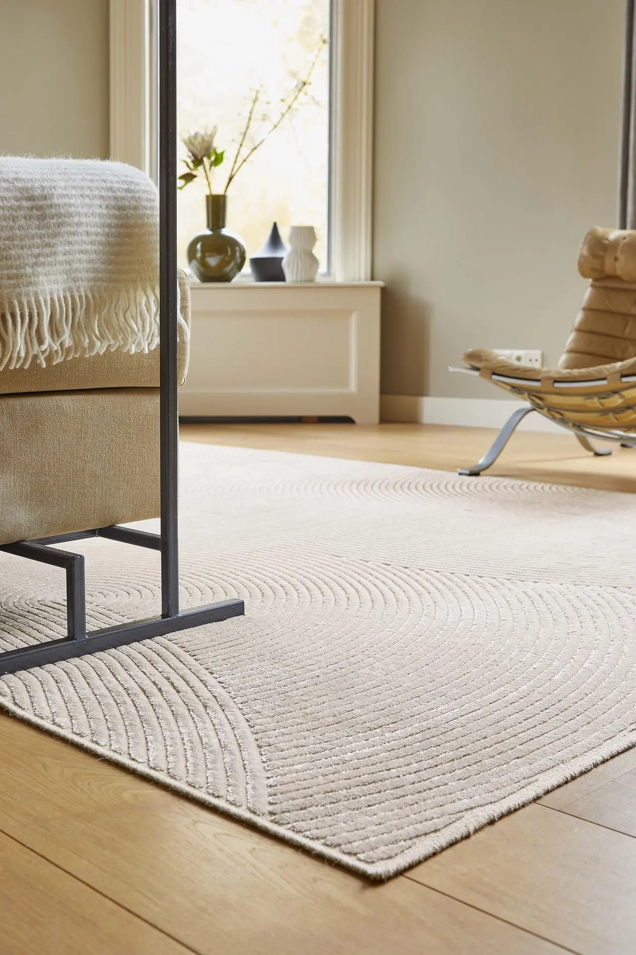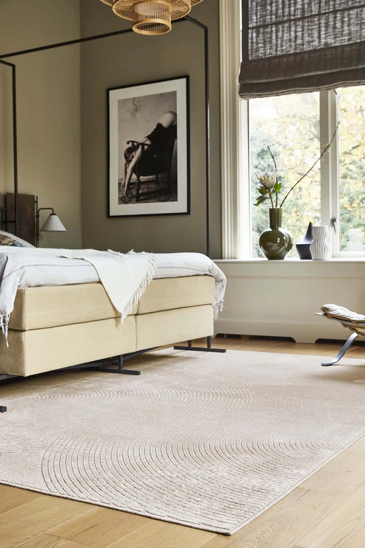 Door de hoog-laag structuur en de lichte naturel tinten ontstaat er een warme en uitnodigende sfeer.